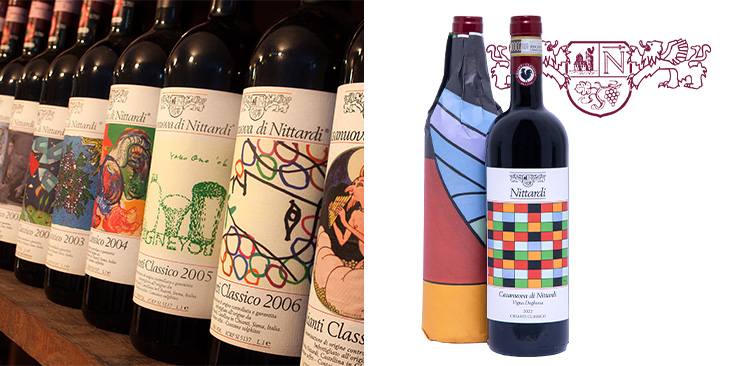 Thus began the tradition of commissioning a new artist each year to design the label for the Casanuova di Nittardi. Over the decades, the series has become a chronicle of modern art: Hundertwasser, Yoko Ono, Günter Grass, Dario Fo, Allen Jones, Karl Otto Götz, Elvira Bach. Each year adds a new voice to the collection, each bottle a reminder that wine itself can carry art.